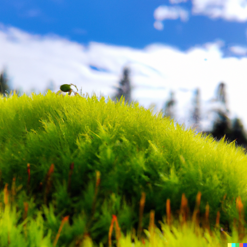 Prompt: "Macro photography of a vibrant green hummock of sphagnum moss with a small 6 legged insect crawling on it. the moss is tall and has fruiting bodies. you can see the sky in the background along with 2 large trees." via DALL-E 2